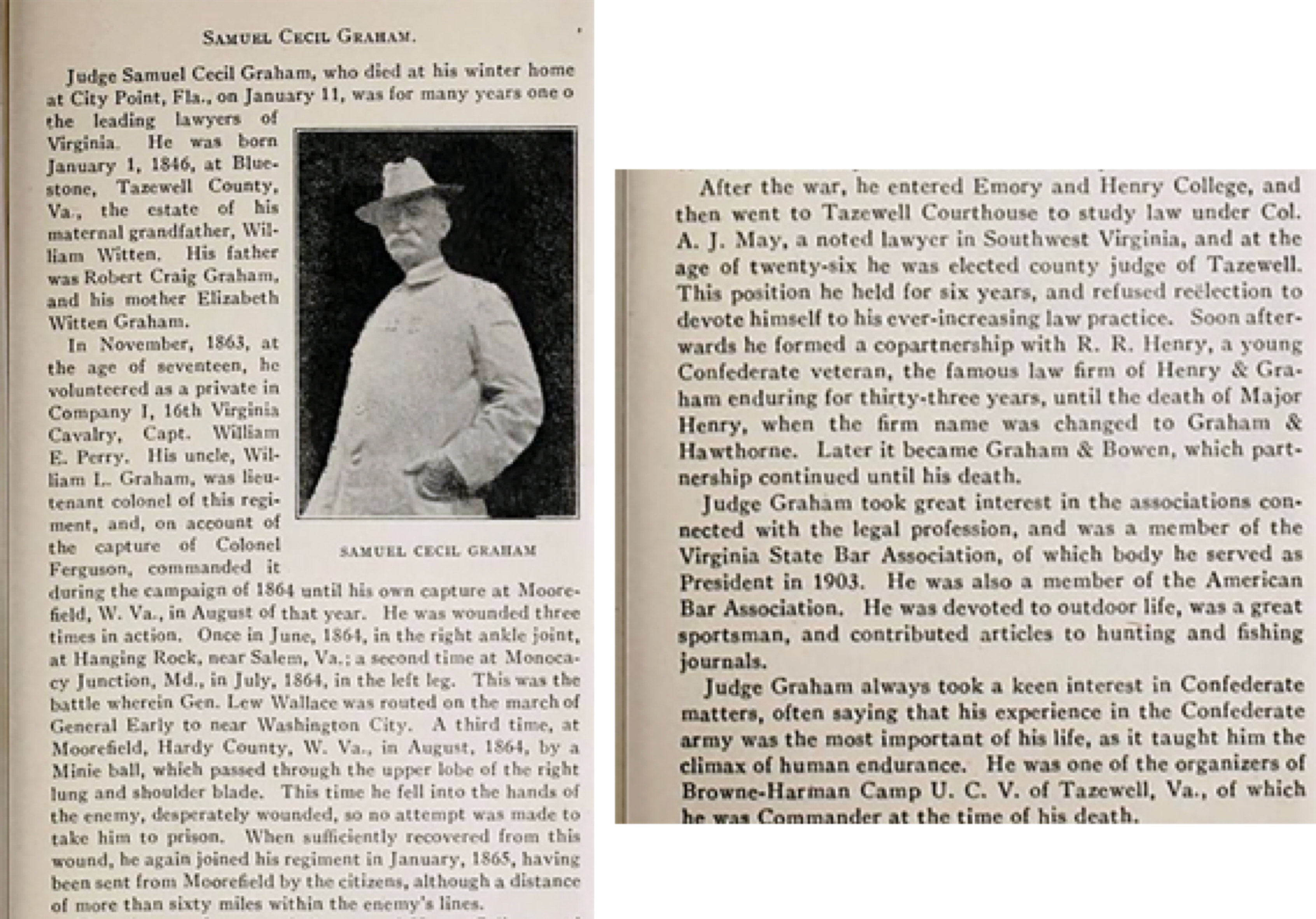 Samuel Cecil Graham, born at "Bluestone," Tazewell county, Virginia, at the home of his maternal grandfather, William Witten, January 1, 1846, son of Robert Craig Graham, merchant and farmer, and Elizabeth Perry Witten, his wife.